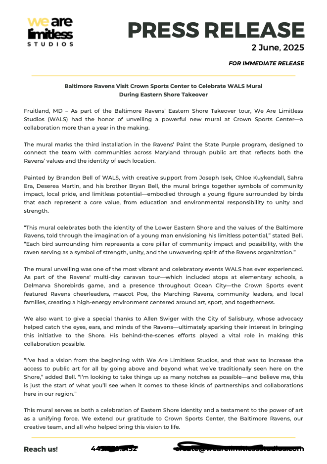 We just did this for our latest mural with the Baltimore Ravens as part of their Paint the State Purple tour—and within days, the press release was shared by media outlets, community leaders, and organizations we never would’ve reached through Instagram alone.